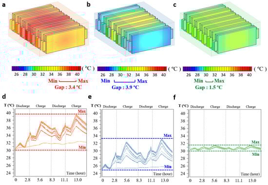 Figure 4d–f show the battery temperatures during charging and discharging under heat-management conditions. In Figure 4d, the LIB without air cooling, the temperature deviation in the module gradually increased over time, and the overall temperature increased. As shown in Figure 4e, thermal management with air cooling reduced the overall temperature; however, it failed to prevent deviations or increases. In contrast, the LImB module in Figure 4e maintained the initial temperature and prevented temperature deviations and increases. The specific mechanisms and heat transmission diagram with the governing equations of the LImB are provided in the literature [18].