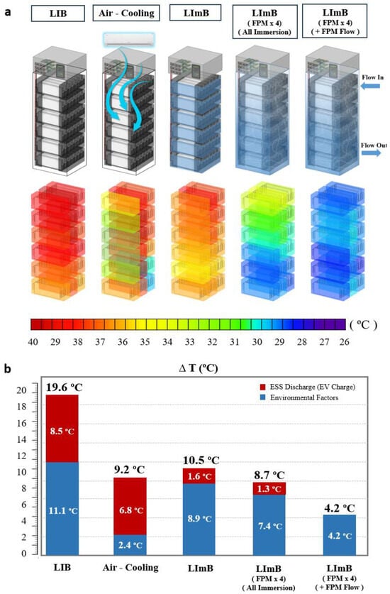 Figure 5a shows a visualization of the temperature of a 10 kWh battery located inside the ESS. In the case of the LIB, the temperature increased to approximately 40 °C overall, and as the high-temperature fluid was light in weight, the temperature was slightly higher in the upper part compared to the lower part. In the case of air cooling, the temperature was lower than that of the LIB without air cooling; however, there was no regular temperature reduction rate depending on the location. In particular, similar to the module experiment, the outer part of the module usually showed a large temperature decrease, whereas the center generally showed a high temperature increase. In the case of the LImB, the minimum temperature was higher than that of the air cooling method, but overall, the rate of temperature decrease was uniform compared to that of the LIB. By increasing the amount of liquid agent applied to the LImB by approximately four times, wherein all the modules were immersed together in the ESS, the heat-management effect was superior. The overall temperature was further reduced; however, on the bottom, it was still higher than that at the top. Lastly, the immersion agent with a flow rate of approximately 0.5 L/s had the greatest cooling effect, and the overall point-to-point temperature was cooled uniformly.