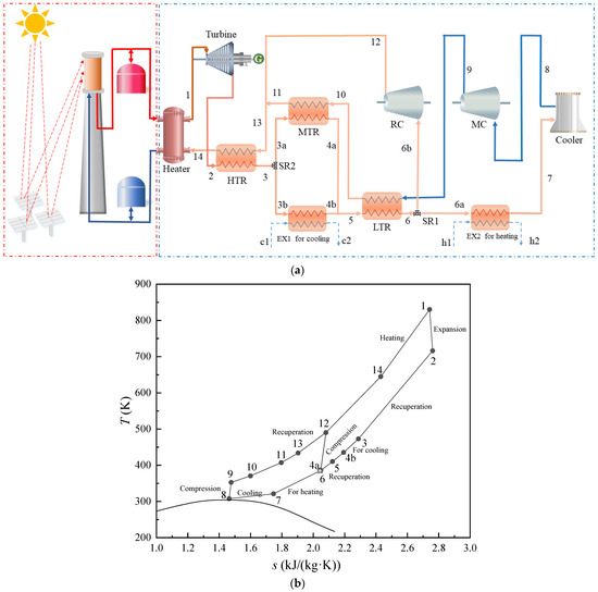 When the CO2 at the inlet of the main compressor reaches a critical point, it is then compressed to a high-pressure state by the main compressor (MC). The compressed fluid sequentially recovers waste heat through the low temperature recuperator (LTR) (9–10) and medium temperature recuperator (MTR) (10–11), ultimately merging with the recompressed stream at node 12. The flow through the high temperature recuperator (HTR) is reheated (13–14). Solar irradiation is concentrated onto the top collector through heliostat reflection, and the low-temperature molten salt from the cold tank is heated as it passes through the collector. The heated molten salt flow subsequently diverges into two streams: one directly supplies thermal energy to unit of CCHP, while the other is stored in the hot storage tank to maintain system operation during solar insolation deficits. The CO2 is heated by molten salt in the heater (14–1), then expands through the turbine for power generation (1–2). After releasing heat at the hot side of the HTR (2–3), the total mass flow rate is split into two streams. One stream enters the exchanger to drive absorption refrigeration (3b–4b), while the other stream flows through the MTR (3a–4a). These two streams recombine at node 5 before entering the LTR for further heat rejection (5–6). Then, the stream is split into two parts. One of the streams enters the exchanger to supply heating, while the other stream is compressed by the recompressor (RC). The CO2 is cooled to near-critical conditions in the air cooler (7–8) to complete the cycle. The T-s diagram of the CCHP is illustrated in Figure 1b.