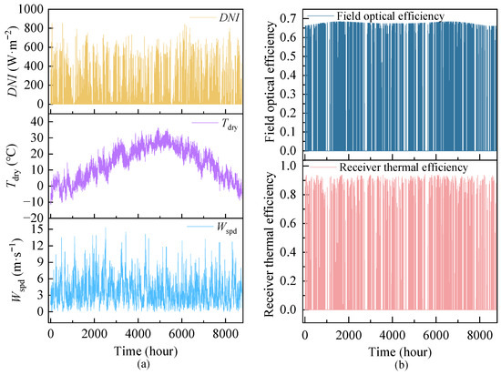 The area is situated in Qingdao City (E119°30′–E121°00′, N35°35′–N37°09′). The reason is that Qingdao belongs to a temperate climate with modest solar irradiation and four distinct seasons. The hourly environmental parameters and collection efficiency are illustrated in Figure 2. The solar tower collection efficiency is defined as the product of receiver thermal efficiency and field optical efficiency.