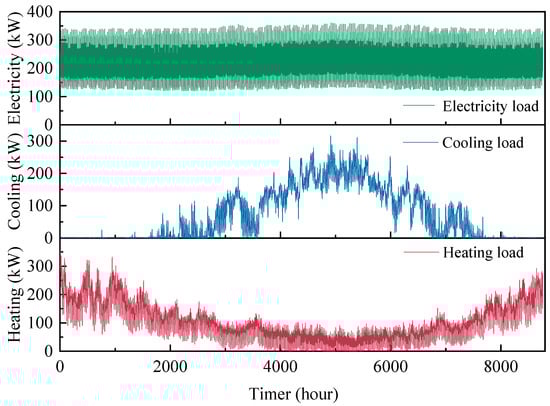 According to the environmental parameters and building model parameters, the annual hourly building energy consumption is calculated. The building load throughout the year is shown in Figure 4. The heating and cooling load is calculated as follows [23]: