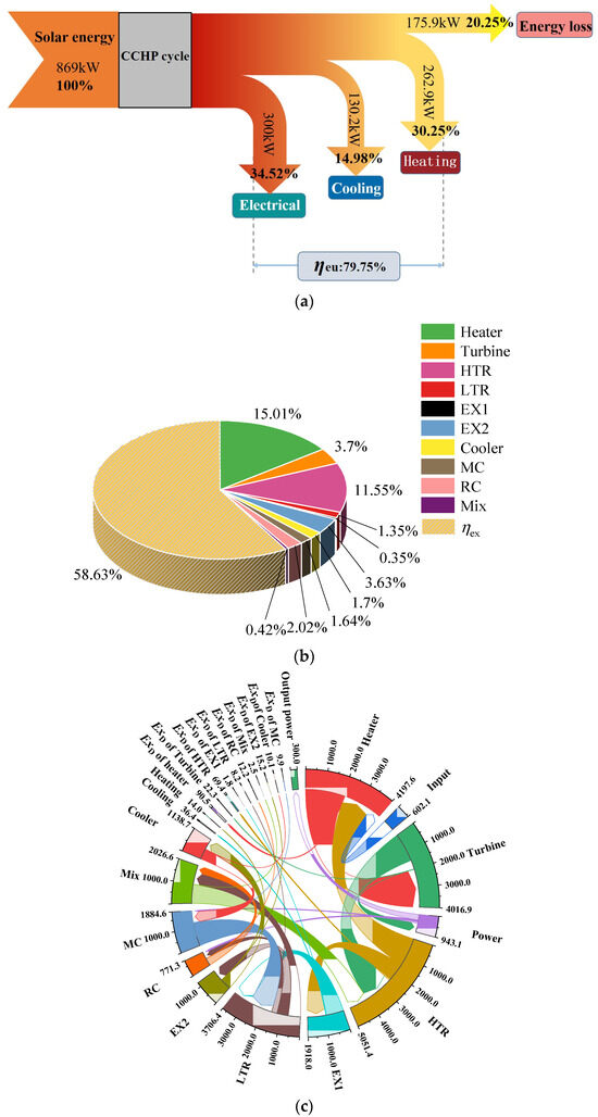 Thermodynamic analyses at the design point: (a) Energy flow. (b) Exergy destructions. (c) Exergy flow.