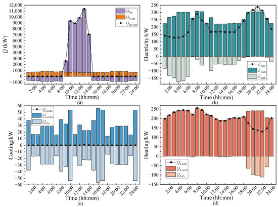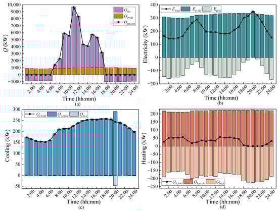 According to the calculation results of the annual building energy consumption, the cooling and heating loads are greatly affected by seasonal fluctuations. Seasonal variations significantly influence energy requirements. The demand for cooling is more intense in summer, while the demand for heating is greater in winter. The electricity demand remains comparatively stable throughout the year. The operation strategy of the following thermal load (FTL) is applied due to the energy demand characteristics of the users. Operational priority is assigned to heat loads during peak heating demand periods. During large cooling demand periods, the cooling load is preferentially satisfied. Furthermore, the cooling, thermal, and electrical output proportions can be dynamically modulated through the adjustment of the split ratio, thereby optimizing energy allocation.