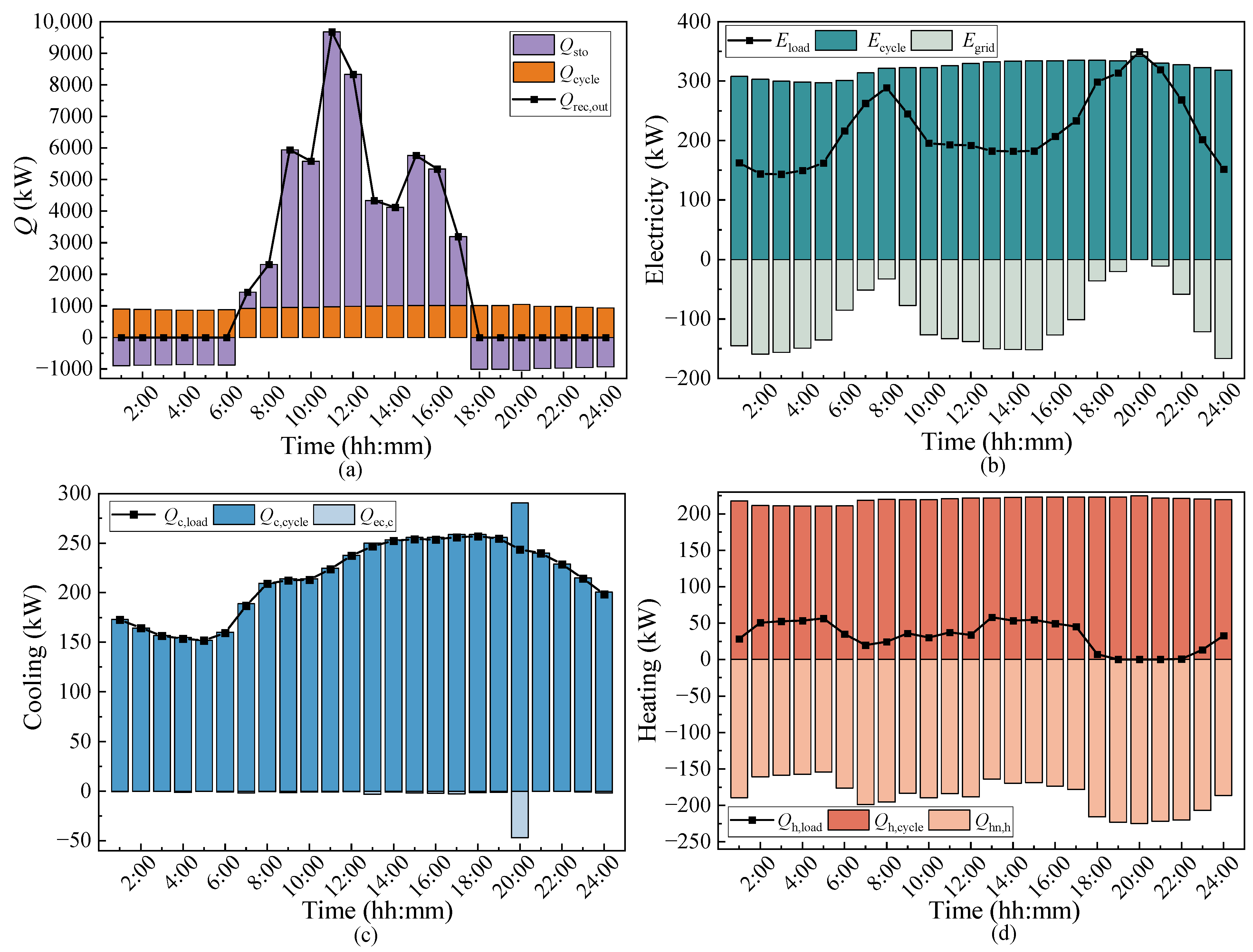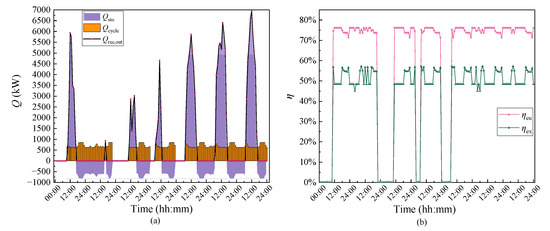 The energy demand and supply on a typical summer day are shown in Figure 9. The Qrec,out represents the heat collection of the solar heliostat field, and Qsto is the thermal energy storage value. When the heat collection of the solar collector exceeds the heat Qcycle required by the system, the remaining heat is stored in the thermal energy storage tank. On the contrary, when the heat collection is not enough to meet the needs of the system, the molten salt flows out from the high-temperature storage tank to release heat; at this time, Qsto is negative. In summer, the cooling demand is the highest and the heating demand is the lowest. Increased summer solar irradiance elevates both turbine inlet temperature and heat recovery efficiency. The solar heat collection and thermal energy storage meet the cooling and heating needs.
