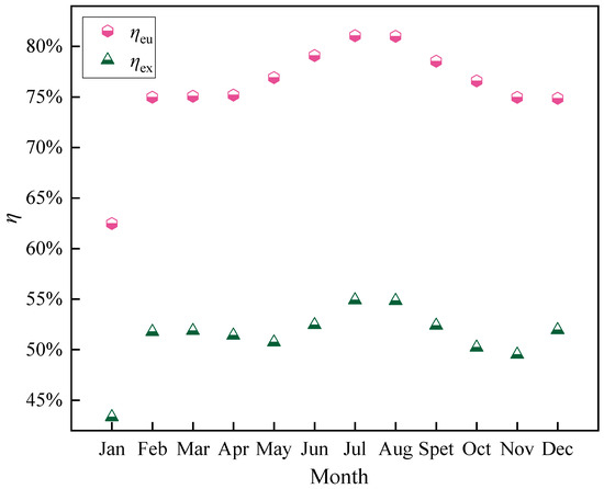 The exergy efficiency is calculated as follows: