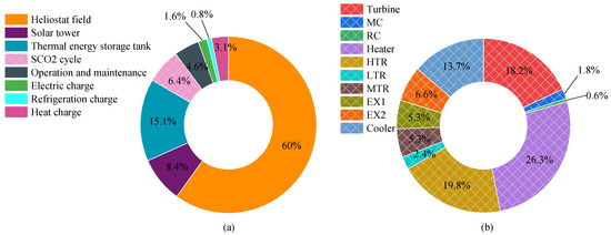 The initial investment cost of the equipment is mainly the investment of the heliostat field, solar tower, heat storage and SCO2 cycle equipment. The heater, HTR, MTR, EX1, EX2, and cooler are all heat exchanger equipment in the SO2 cycle. The calculation is as follows:
