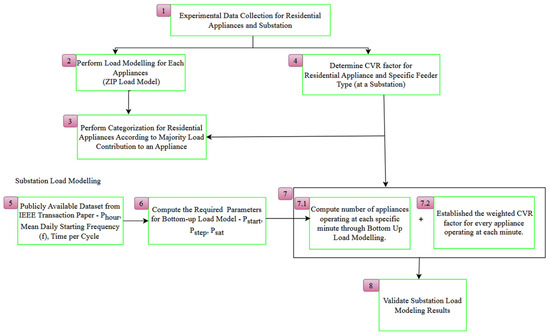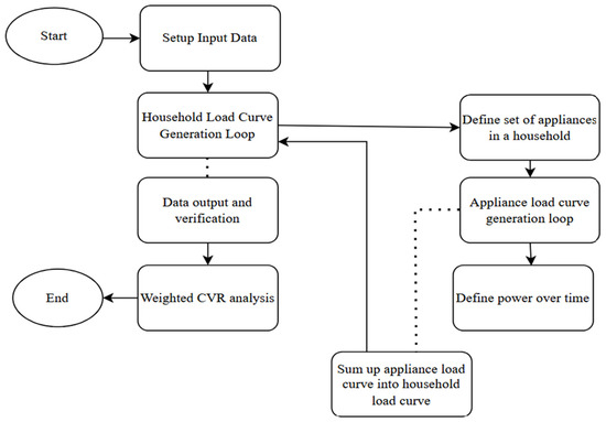 Additionally, the CVRf calculated in this study was integrated into the bottom-up model analysis to generate the CVRf both at the household level and for the entire residential substation. The simulation process for the bottom-up load model is depicted in the flowchart in Figure 5, providing a clear overview of the steps used in the analysis. This structured approach ensures consistency and accuracy throughout the modeling process.