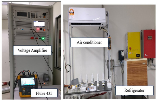 This paper focuses on the Malaysian residential scenario. The appliances that were used to collect the data are basic appliances that exist in most residential households with regard to all types of residential class. The data for analysis were obtained from the measurements conducted in the laboratory. There were 16 common items of household equipment used for the ZIP and CVR measurements. The load profile was obtained by changing the input voltage from 250 V to 215 V. This range was utilized to reflect the permissible range of voltage fluctuations under the Malaysian Tenaga Nasional Berhad (TNB) standard, which allows a variation of +10% to −6% from the nominal voltage of 230 V. TNB is Malaysia’s sole power distributor and the largest electricity producer in the country. By adjusting the voltage within this range, the study captured the real-world operating conditions of appliances experienced in Malaysia. This ensured that the derived ZIP load model and CVR analysis accurately represents the appliance behavior under typical voltage deviation standards. Moreover, testing within this range allows for the assessment of how voltage variations impact power consumption, load dynamics, and overall power quality, aligning the study with practical and regulatory considerations. The voltage supply was adjusted in 5 V increments to align with the low-voltage transformer tap changer behavior and ensure consistency with previous research methodologies. This step size captures the detailed, incremental changes in appliance power consumption, enabling the precise derivation of ZIP load coefficients and provides a balance between resolution and practicality. The Fluke 435 Power Quality recorder was used to measure the power changes every second. The Fluke 435 Power Quality recorder was used in the analysis because it provides high-precision measurements of electrical parameters, including voltage, current, and power, with a 1 s resolution. This accuracy is crucial for capturing the subtle variations in appliance power consumption as the voltage levels change, which are essential for deriving the ZIP load model. Additionally, the Fluke 435 is specifically designed for power quality analysis, ensuring reliable data collection under diverse conditions and making it well suited for both the laboratory and substation measurements required in this study. The equipment that was tested included an air conditioner, CFL light, fluorescent light, incandescent light, LED light, fan, laptop, personal computer (PC), phone, tablet, television (TV), microwave, rice cooker, shower heater, kettle, and refrigerator. Figure 2 below shows the connection established in the laboratory for the measurement.