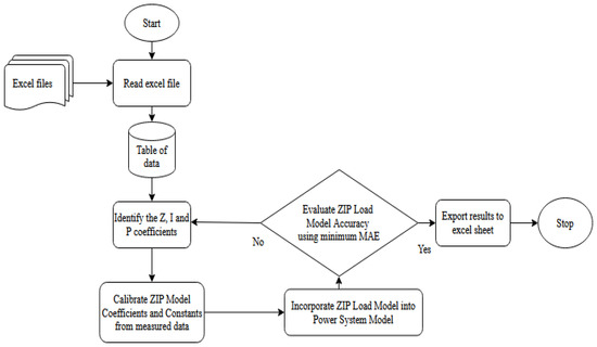 Based on the equations displayed above, P0 refers to the initial steady-state active power, V0 refers to the initial steady state-voltage, V refers to the new voltage, the ZP, IP, and PP represent the impedance and current terms that act like sensitives around the base constant powers [32], and n refers to the number of appliances used in this study. Figure 3 shows the flow chart used to determine the ZIP load model where the data collected from Section 3.2 were incorporated into the Python script to identify the ZIP coefficients and confirm that the values comply with the constraints of summing to 100% and that the ZIP values must be positive. The initial ZP, IP, and PP values are estimated small numbers, and multiple iterations were performed to determine the most suitable ZIP value. The PZIP measured and calculated was used to determine the MAE error value by incorporating the ZIP load values into the power system model represented by PZIP. Thereafter, the smallest MAE value shall represent the ZIP load model for each specific appliance.