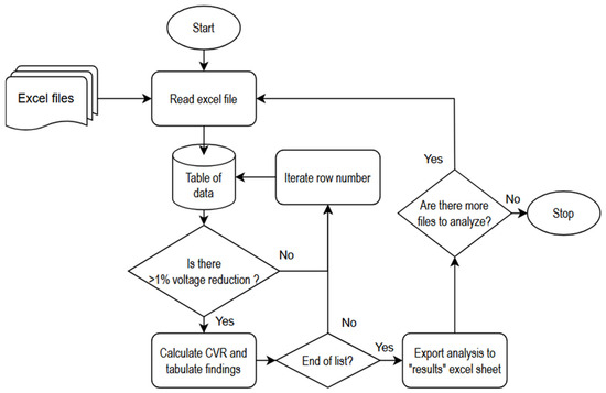 Figure 4 illustrates the flowchart used to determine the CVRf for the substation network. A Python script extracts values from the data, which are then used to calculate the CVRf for the system each day. Every data point is compared with subsequent values, and a voltage drop exceeding 2.3 V triggers the CVRf calculation. The analysis of residential appliances’ CVR was verified by comparing it with the daily 100% residential substation CVRf.