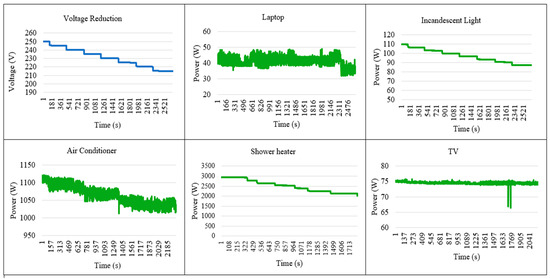 As for the other appliances, the duration of measurement was determined based on the power behavior of the appliances regarding the voltage change where every voltage reduction displayed a consistent power behavior for each voltage drop. As for the lighting devices such as the incandescent, CFL, florescent, and LED lights, each light was measured for a duration of 50 min. This similar concept was utilized for the fan (stand fan, 3 blades—speed 3), laptop while being charged, tablet, shower heater (conventional water heater—without a pump and at a medium temperature), PC, handphone (android), and TV (40-inch television). However, for the microwave (manual microwave), the measurement was conducted for a duration of 1 min for every voltage change, and as for the rice cooker (manual 1.8 L), the measurement was recorded throughout the duration of rice being cooked.