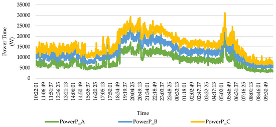 Figure 7 displays the residential substation data measured over 24 h for each phase, collected at the same substation over three days with recordings taken every second. The power pattern shows peak consumption in the morning and late evening. The CVRf was calculated only for consistent voltage drops across all three phases at the same time. This approach ensures the accuracy and reliability in determining the CVRf.