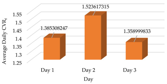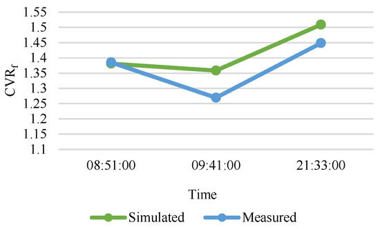 Given this similarity, further correlation analysis is necessary to assess the consistency of the simulation in replicating real-world conditions. The comparison between the simulated and measured CVRf values reveals a close alignment at certain specific times of the day as displayed in Figure 15. Particularly in the morning at 8:51, the difference is minimal at 0.30%. The simulated and measured values show a larger discrepancy in the morning at 9:41, where the measured CVRf is 1.26930 compared to the simulated 1.35851, resulting in a 6.57% difference. Similarly, at night at 9:33, the measured CVRf is 1.44870, showing a 4.00% deviation from the simulated 1.50899. Despite these differences, the overall trends are similar, indicating a strong relationship between the simulated and measured data.