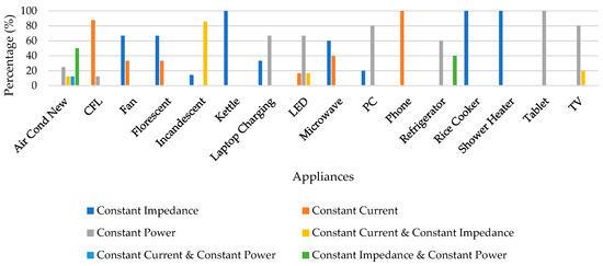 Based on the categorization performed in Table 4, the results were further enhanced by performing percentage normalization, to provide a clearer representation of the data distributions as displayed in Figure 9. The analysis of 16 appliances reveals varied load behaviors, highlighting the key trends in their categorization. The TV and PC (80% indicates constant power), refrigerators (60% indicates constant power), laptop charging and LEDs (66.7% indicates constant power) and tablet (100% indicates constant power) predominantly maintained fixed power consumption, while CFL (87.5% indicates constant current) and phones (100% indicates constant current) exhibited consistent current draws. Resistive behavior dominates in appliances such as microwaves (60% indicates constant impedance), for fans and florescent lights (66.7% indicates constant impedance) meanwhile kettle, rice cookers, and shower heaters (100% indicates constant impedance). Mixed behaviors appear in incandescent lights (85.7% indicates constant current and constant impedance) and air conditioner (a total of 50% indicates constant impedance, constant current and constant power load combination). The reliability of these results is higher for appliances with dominant percentage categories. However, appliances with distributed percentages, especially for air conditioner, microwaves and refrigerators, may reflect variations due to appliance design, operating conditions, or differences in the measurement methodologies.