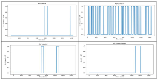 As mentioned above, understanding the load profile and behavior of appliances is essential for accurately modelling the total power consumption within a residential network. The diagrams below illustrate the activity patterns of each appliance, which are crucial for calculating the total power values. These values are derived from the duration during which each appliance is switched “on” or “off”. Figure 10 displays the daily switch-on (which is indicated with 1) and switch-off (which is indicated with 0) activities for some appliances within a household, offering a detailed view of their operation patterns. These appliance activity data must be established foremost to accurately perform the power analysis that follows, as they form the basis for the subsequent load and CVRf calculations. Without this step, the analysis of power consumption and voltage reduction effects would lack precision, underscoring the importance of understanding appliance behavior in the overall CVR strategy. The purpose of the bottom-up load model is to ensure the accuracy of the simulated CVRf in Section 4.3 above.