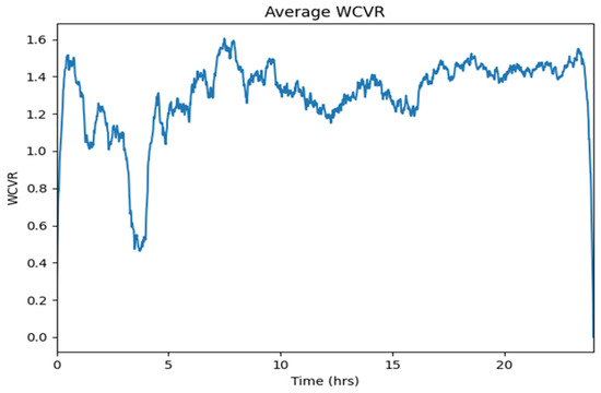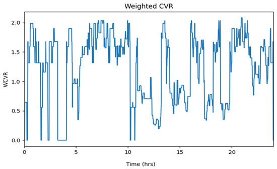 To simulate this, a random number generator in Python was used to compare the values. An appliance is turned “on” when the starting probability Pstart exceeds a randomly generated number between 0 and 1. After the appliance turns off, the starting probability is re-evaluated using Pstart. If the appliance starts again, its nominal power consumption (Pnom) is added to the household’s total load curve (Ptot). For appliances with standby power consumption (Pstandby), this standby power is included in the total load curve at all times, regardless of whether the appliance is actively in use or idle, as outlined in Equation (10). Additionally, a plot was generated for the weighted average CVRf (WCVR) based on Equation (11), which calculates the CVRf for each minute according to the contribution of appliances that are turned on at that time. Equation (11) is summed for each household and divided by the total number of houses analyzed to determine the weighted CVRf per minute, representing the CVRf of a residential feeder. This was performed for the number of appliances (n) analyzed in this study.