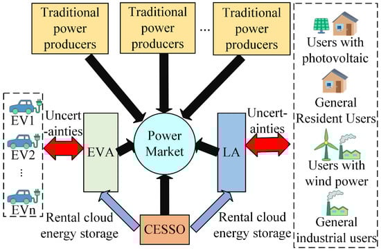 With the rapid development of the power industry, the existing power market system struggles to accommodate the evolving grid environment [1,2,3]. To establish an efficient and competitive electricity market, many countries have implemented varying degrees of reforms on the supply side [4]. This has led to the emergence of new market participants alongside traditional power producers. Among these emerging entities, energy producers and sellers represented by electric vehicle aggregator (EVA), cloud energy storage system operator (CESSO), and load aggregator (LA) constitute the primary components. These entities are primarily formed through the integration of adjustable resources on the user side.