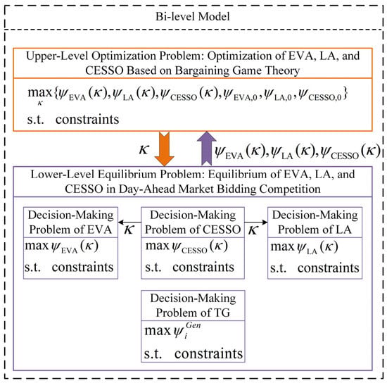 Considering the oligopolistic market structure characteristics inherent in practical electricity markets, all participants engage in market competition as autonomous entities that prioritize individual profit maximization as rational economic agents. Consequently, the formation of leasing cooperation agreements between EVA/LA and CESSO must satisfy the Pareto improvement criterion relative to non-cooperative game scenarios where these entities compete independently. Rational participants would reject unfavorable terms that fail to enhance their individual payoffs. Thus, within the framework presented in Figure 1, the electricity market equilibrium analysis requires simultaneous consideration of both the market-level competition and the strategic interactions regarding cloud storage leasing prices among EVA, LA, and CESSO, collectively forming a bi-level hierarchical game-theoretic structure.