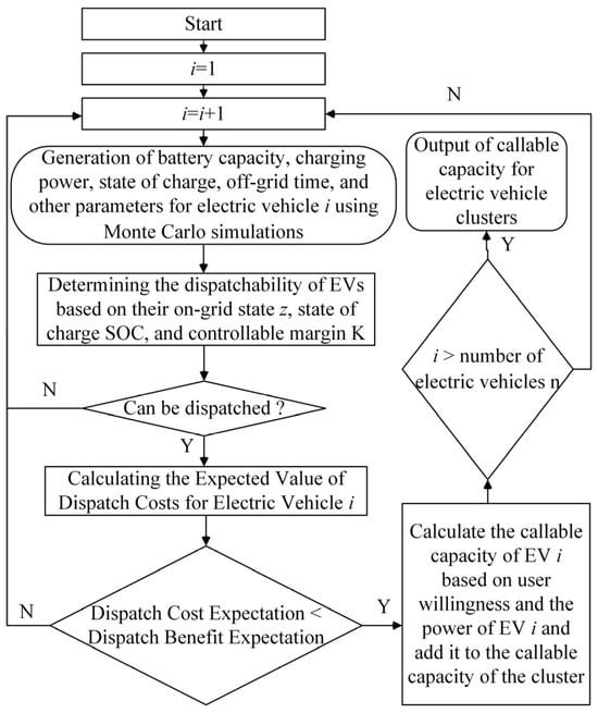 The Monte Carlo simulation method is employed to generate multiple stochastic scenarios based on the PDFs defined in Equations (11)–(14). By integrating grid-connected status, state of charge (SOC), dispatch cost expectations, and user willingness coefficients, the aggregate dispatchable capacity of EV clusters can be determined across different scenarios. This multi-scenario simulation framework forms the basis for EVA’s bidding strategy formulation, with the complete simulation workflow illustrated in Figure 3.
