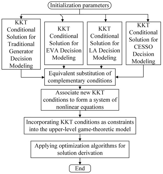 According to the analysis of ref. [33], we adopt the nonlinear complementary method to solve the electricity market equilibrium model constructed above. The solution flow chart is shown in Figure 4.