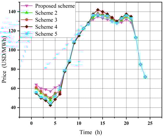 The electricity market equilibrium prices under different scenarios can be determined through the integration of the solution methodology outlined in Section 4.6 and the modeling approach presented in Section 5.2 for cases excluding CESSO’s cloud energy storage leasing service. These equilibrium price results, corresponding to various operational scenarios, are graphically depicted in Figure 5.