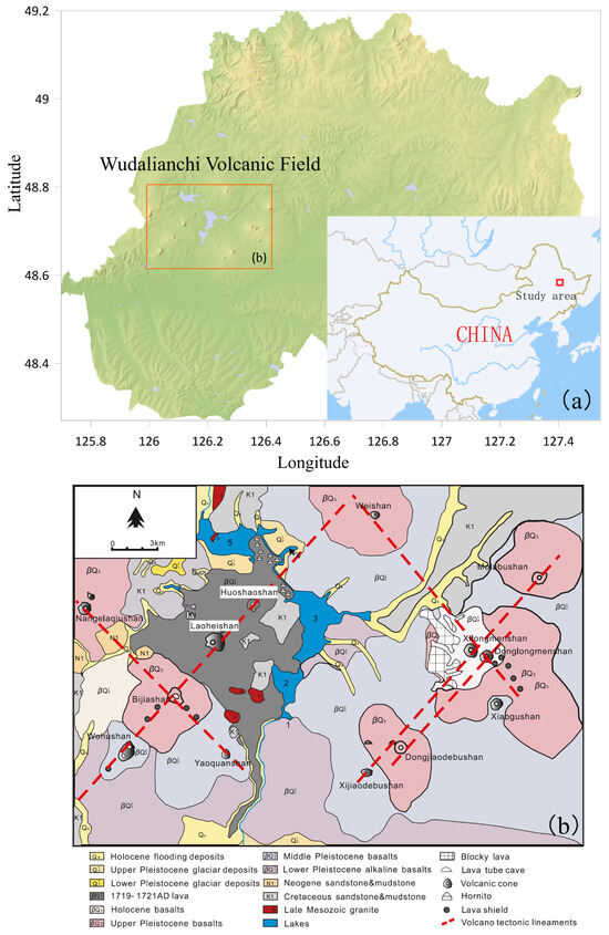 Figure 1. (a) Wudalianchi geographical location map. (b) Wudalianchi geological map. (modified after Xiao and Wang [34]).