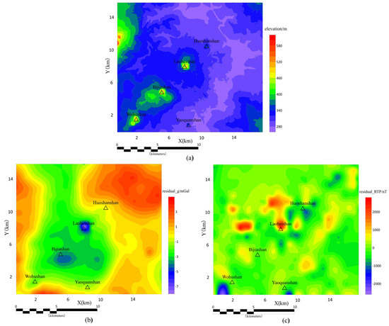 Figure 2. (a) Elevation map of the survey area. (b) Map of the residual gravity anomalies in the survey area. (c) Map of the residual magnetic anomalies after demagnetization in the survey area.