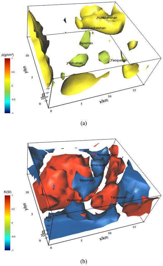 Figure 3. Joint inversion results map. (a) Three-dimensional residual density distribution map. (b) Three-dimensional residual magnetic susceptibility distribution map.