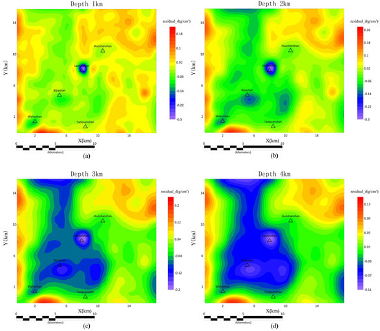 Figure 4. Residual density horizontal slice map: (a) depth 1 km; (b) depth 2 km; (c) depth 3 km; (d) depth 4 km.