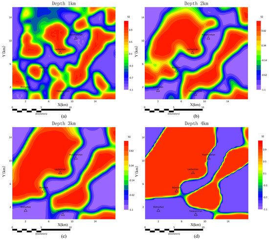 Figure 5. Residual magnetic susceptibility horizontal slice map: (a) depth 1 km; (b) depth 2 km; (c) depth 3 km; (d) depth 4 km.