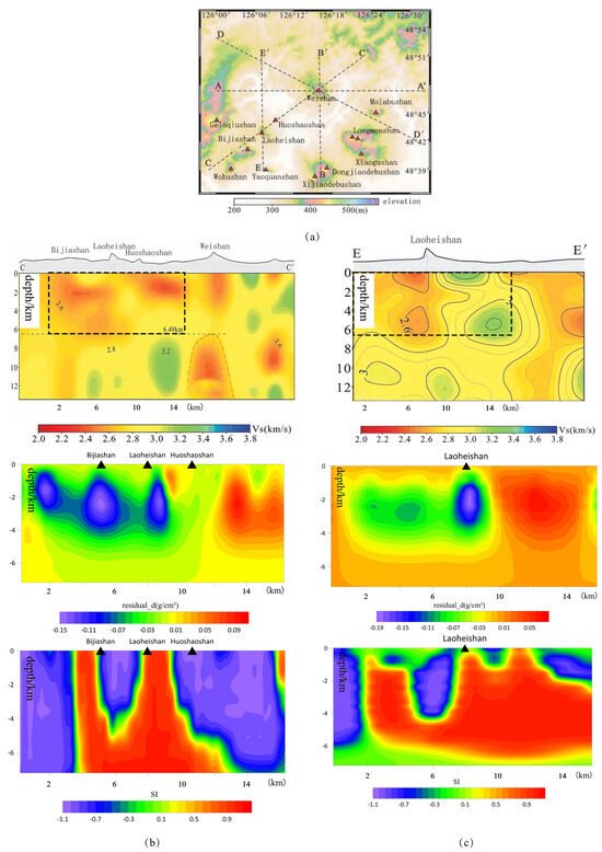 To verify the reliability of the above inference, this paper combines the gravity and magnetic inversion results with the seismic velocity map of the underground structure in the Wudalianchi area, obtained by Zhang et al. [42], for a comprehensive analysis, as shown in Figure 6. From Figure 6, it can be seen that the underground bodies with both high magnetism and low density beneath the Laoheishan and the Bijiashan also exhibit the characteristics of low-velocity bodies. Furthermore, these low-velocity bodies are interconnected, forming a unified structure. This further supports the previous conclusion regarding the interconnection of underground low-density, high-magnetization bodies. Li et al. (2016), in their high-precision seismic imaging of the Wudalianchi area, interpreted the shallow low-velocity bodies beneath the Laoheishan and Huoshaoshan as highly fractured underground rock masses filled with fluids [41]. The seismic wave velocity map and conclusions provide a clear explanation for the earlier observation of low-density inversion results beneath the volcano, despite the presence of high-density basalt. This confirms that the basalt beneath Laoheishan and Bijiashan volcanoes is a mixed rock body containing fractures and fluids. The formation of such a mixed rock body aligns with the characteristics of a cooling magma chamber, ruling out the possibility of residual heat from a magma chamber or the presence of hot dry rock. Figure 6b clearly shows that the low-density rock bodies beneath Laoheishan and Bijiashan are connected through a channel. Additionally, the high magnetic susceptibility rock bodies beneath Bijiashan and Laoheishan converge to form a U-shape at around 5 km depth. Figure 6c further indicates that a similar U-shaped convergence is formed beneath Laoheishan, near the vicinity of Yaoquanshan. According to the view that the high-magnetic rock bodies are formed during volcanic eruptions and consist of basalt carrying remanent magnetization, this U-shaped distribution indicates that the magma channels beneath Bijiashan and Laoheishan converge at a certain depth. This suggests that these two volcanoes may share a common magma source deep underground.