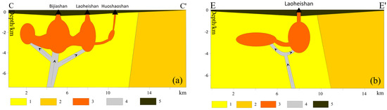 Figure 7. (a) Geological map along the CC′ direction. (b) Geological map along the EE′ direction. 1, granite; 2, metamorphic rock; 3, basalt; 4, inferred magma conduit; 5, mixed rock layer of basalt and mudstone-sandstone.