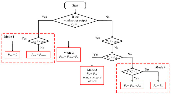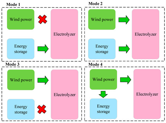 Operation mode 1: When the fan output power is 0, the fan, due to maintenance or no wind, will enter the shutdown state. At this time, the minimum power of the electrolyzer from the battery will be provided once to ensure that the hydrogen electrolyzer maintains minimum power operation. At this time, Pbat = Pelmin. If the SOC of the storage battery is so low that it is not possible to keep the electrolyzer to maintain minimum power operation, the operation of the electrolyzer is stopped.