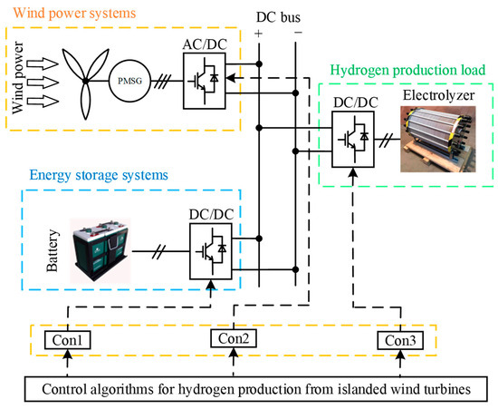 The wind power integrated hydrogen production control system analyzed in this paper consists primarily of a wind turbine, a permanent magnet synchronous generator, a PEM electrolyzer, and a battery storage system. The overall configuration of this system is depicted in Figure 2.