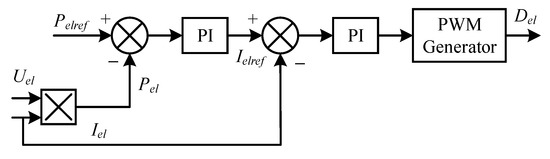 The electrolyzer control strategy consists of a power outer loop and a current inner loop. In the DC–DC control system, the product of port voltage and current is the power. After passing through the PI controller of the power outer loop, the output is the current reference value, which differs from the current acquisition value and passes through the PI controller of the current inner loop. Finally, a signal wave is formed to the pulse width modulation generator. This strategy controls the current by controlling the power and is suitable as a power supply for variable power loads.