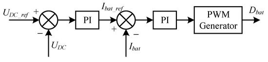 The control strategy of the storage battery consists of a voltage outer loop and a current inner loop, which are similar to the electrolyzer control method. After the PI controller of the outer voltage loop, the output is the current reference value, which differs from the current acquisition value and passes through the PI controller of the inner current loop. Because the energy storage system involves charging and discharging, the voltage difference between the terminal voltage of the storage battery and the DC bus determines the direction of the current.