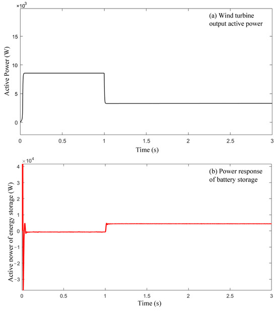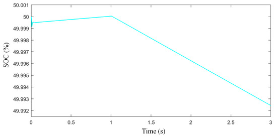 Because the energy storage system itself exhibits capacitive characteristics, moments of high wind speed variation are suitable for testing the energy storage system. The wind speed is defined as 11 m/s at sampling 0, decreasing to 8 m/s after 1 s and maintaining this speed for the following 2 s. Based on the rapid change in wind turbine power, it is found at this point that the electrolyzer’s power remains constant, and the initial SOC of the storage battery is 50%. Figure 10, Figure 11 and Figure 12 show the power output of the energy storage unit, the change of the state of charge, and the operation of the DC bus voltage, respectively. It can be observed that when the power of the wind turbine in Figure 10a rises and then falls, the power of the energy storage unit changes accordingly. As shown in Figure 10b, it can reflect how the energy storage unit regulates the power in the fluctuation of the wind power system to ensure the stable operation of the system.