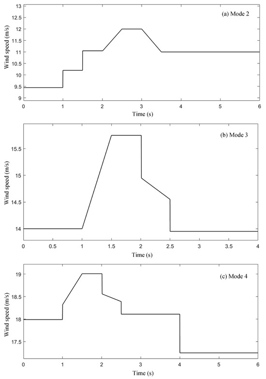 To assess the effectiveness of the control strategy for the wind power hydrogen production system, the complete model is developed and simulated using the MATLAB/Simulink platform in this study. The simulation duration for all four modes is set between 4 to 6 s, as this timespan allows components, such as wind turbines, to respond and stabilize swiftly. Wind data are simulated using wind modeling equipment, which includes stepwise and gradually varying wind speeds, as illustrated in Figure 13. For Mode 1, we set the wind speed to zero, representing a scenario where wind forces are insufficient to drive the wind turbine, effectively halting its operation.