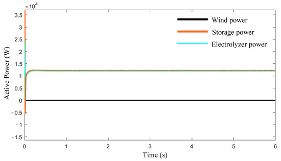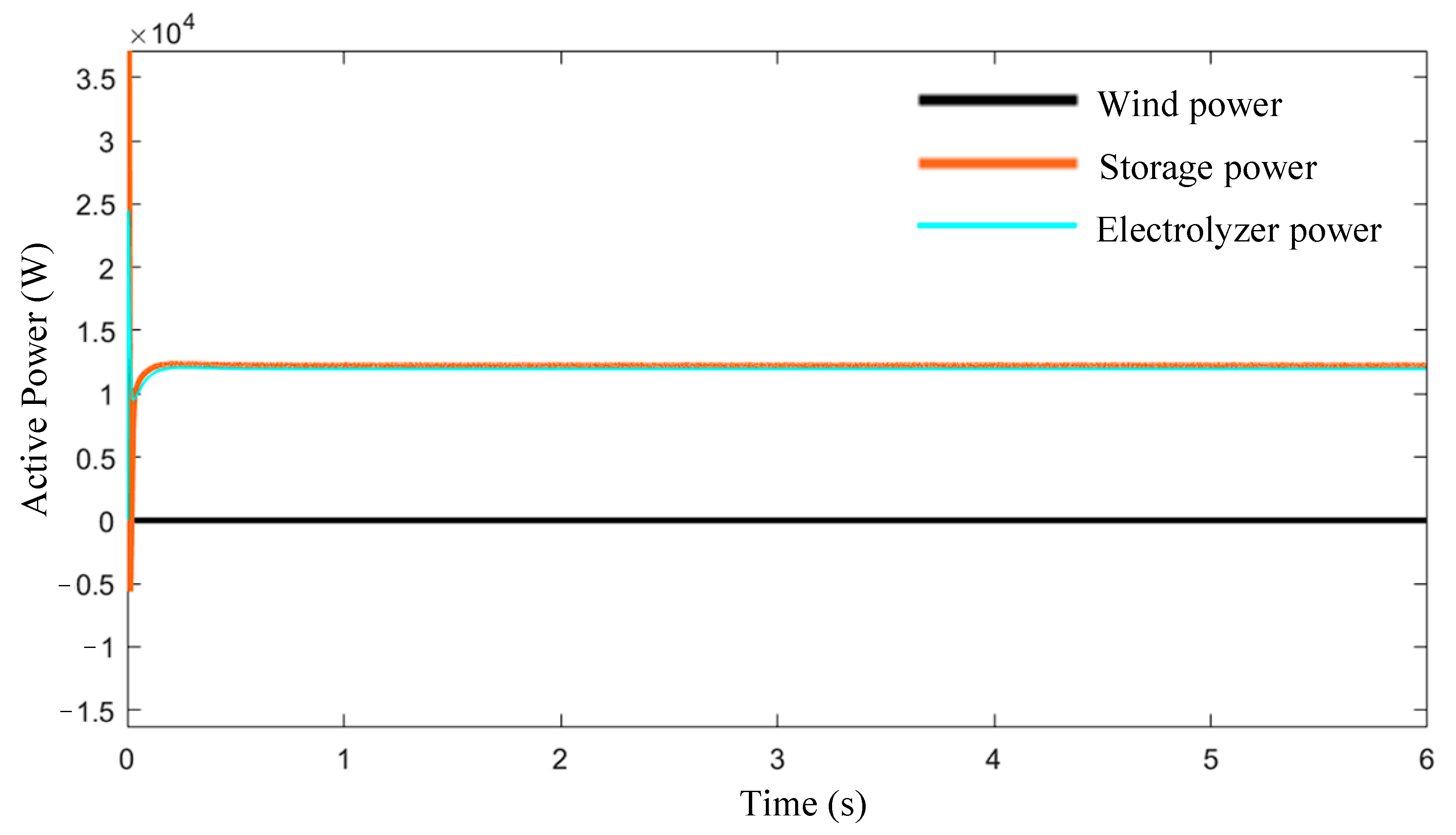 Figure 14 depicts the power output simulation when the system operates in Mode 1. In this scenario, the wind turbine is unable to function due to either maintenance issues or inadequate wind speed. As a result, the energy storage unit solely provides the minimum required power for the electrolyzer to ensure that the hydrogen production process continues at its minimum power level.