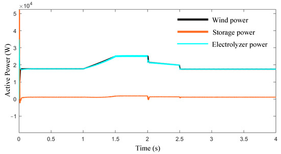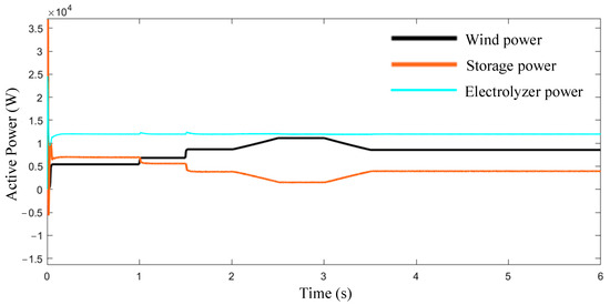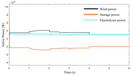 Figure 17 depicts the power simulation for operation Mode 4. In this mode, the wind turbine operates in a high wind speed range, with its output exceeding the electrolyzer’s rated power. As a result, the energy storage unit begins to charge, absorbing the surplus wind energy. Once the energy storage unit nears its upper capacity (SOC = 98%), the turbine switches from MPPT mode to constant power control mode. The figure illustrates that the energy storage unit absorbs excess power until 4 s, at which point it reaches full capacity and ceases to charge. Subsequently, the energy storage unit’s power drops to zero, and the turbine shifts to a reduced power mode to meet the electrolyzer’s rated power demand.