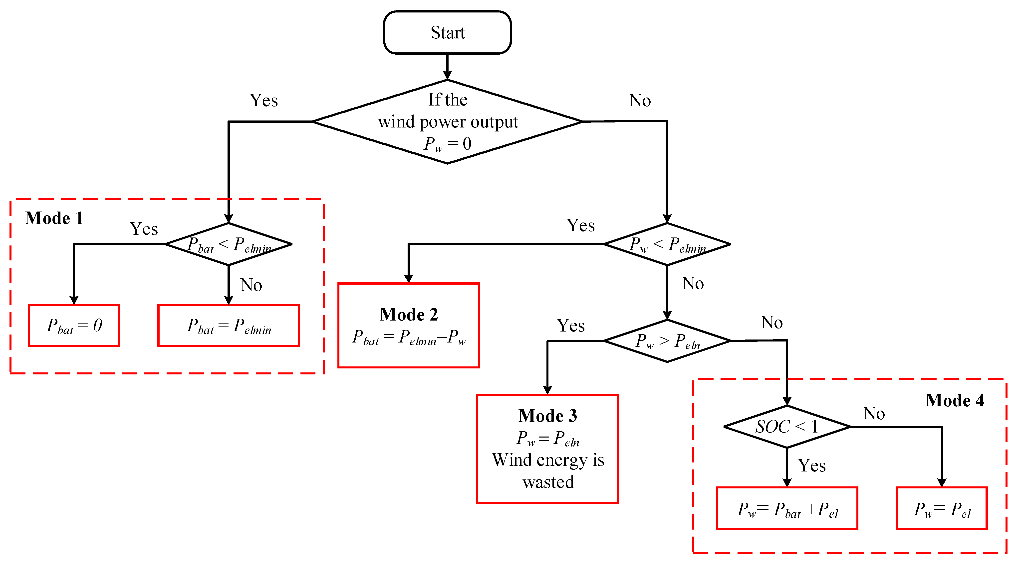 Operation mode 4: When the wind power is full, the wind power output is greater than the rated power of the hydrogen generation electrolyzer. At this time, the wind power output can not only maintain the rated power of the hydrogen generation electrolyzer to work normally but also the wind power output exceeds the rated power of the hydrogen generation electrolyzer residual power, which allows for energy storage battery charging. In this mode, the storage battery is in a charging state to maintain the power balance of the system: Pw = Pbat + Pel. When the energy of the storage battery is saturated, the wind power output will be higher than the rated power of the hydrogen generator electrolyzer, and then there will be a certain amount of wind abandonment phenomenon to reduce the wind power output, and therefore there is a new power balance of the system: Pw = Pel.