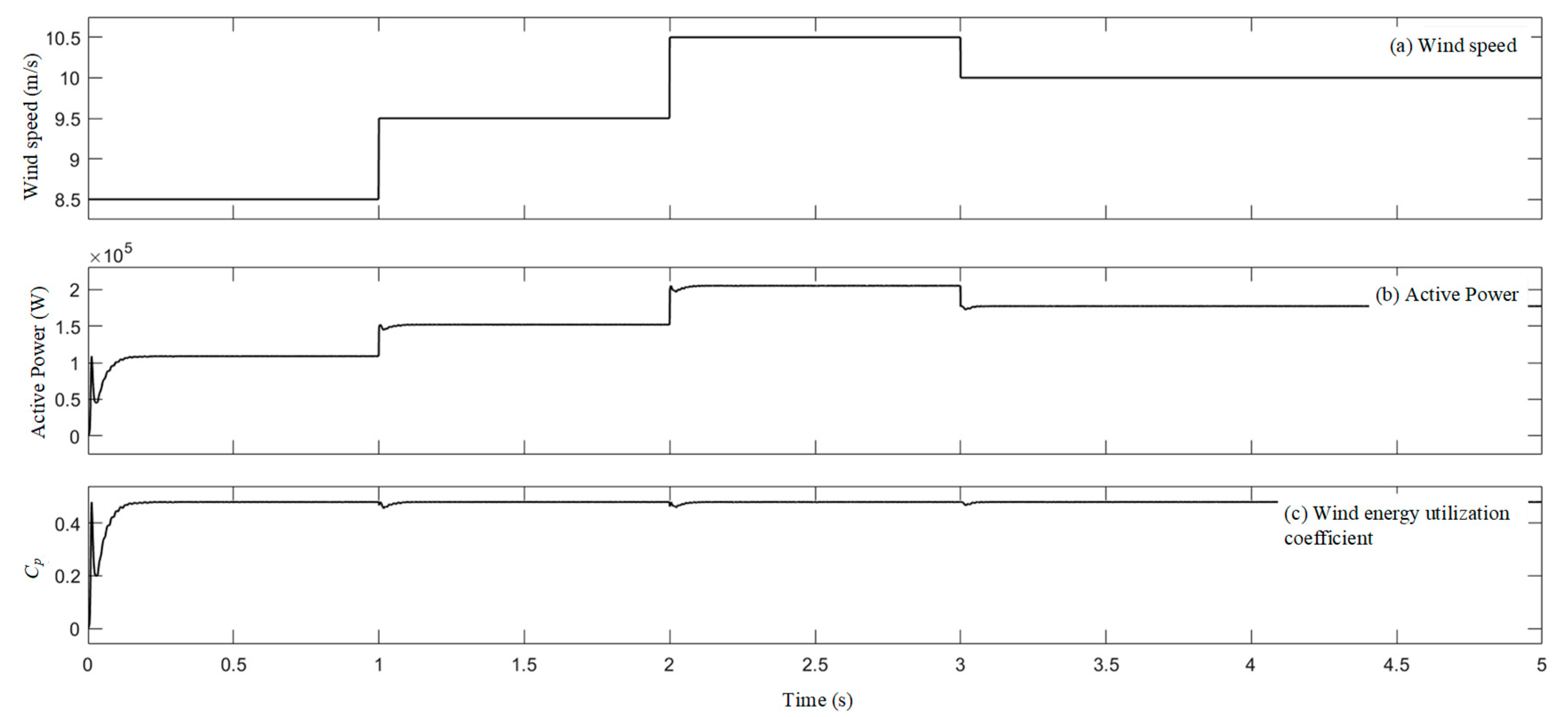 where Pm is the output power of the wind turbine; Cp(λ, β) is the power coefficient; ρ is the air density; A is the area swept by the wind turbine blades; and v is the wind speed. The wind energy capture factor is [27]