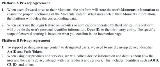 In Android all-in-one devices, applications typically operate in collaboration with multiple SDKs alongside the main business code. User privacy data are often retrieved through these SDKs. For instance, data such as device ID, electricity usage, address, and device status can be indirectly accessed from the operating system through data retrieval interfaces provided by the Android SDK. In addition, privacy data specific to certain platforms can be obtained through SDK libraries provided by the manufacturers of power equipment. However, the user privacy data from these specific platforms varies in format and lacks a unified and clear naming convention []. As shown in Figure 1, different platforms contain different privacy-sensitive entities. For example, on Platform A, the privacy-sensitive entities include Moments, OpenID, etc., while on Platform B, the privacy-sensitive entities include AAID, Push Token, OID, and GID, among others. In power equipment scenarios, user data such as location, electricity usage patterns, and the rela-tionships between devices are involved. When these data are combined with privacy-sensitive entities like social media Moments or OpenID, it may expose personal aspects of the user’s life and behavioral patterns, increasing the risk of privacy breaches.