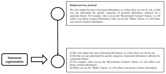- Sentence Segmentation: the original privacy policy text is segmented using sentence delimiters to ensure that sentence lengths are concentrated within a specific range. Initially, common delimiters (such as periods, exclamation marks, and question marks) are used for segmentation. For sentences exceeding 100 characters, further segmentation is performed using commas, colons, and semicolons to ensure sentence length is close to 100 characters. For special sentences, Stanford CoreNLP is used for syntactic analysis to extract the longest sub-clause (as shown in Figure 2).