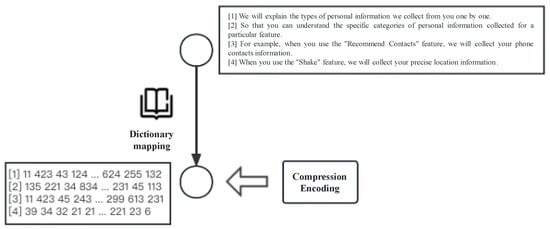 - Compression Encoding: the segmented sentences are mapped into compact sentence vectors using short integers, preserving the core semantics. A variable-length character encoding scheme is employed to compress the data, and a character encoding mapping dictionary is constructed using the THUCNews dataset to enhance the efficiency of the encoding process (as shown in Figure 3).