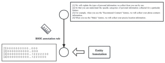 - Entity Annotation: based on a predefined list of sensitive privacy entities, each sentence vector is annotated using the BIOE tagging scheme. The annotation dimension is fixed at 100, with short sentences padded with zeros and long sentences truncated (as shown in Figure 4).