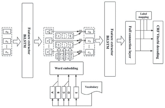 In this paper, the fused word embeddings ,, and from different label classifications are concatenated and then stacked onto the character embedding representation , resulting in the character embedding representation that helps the model understand lexical information, as shown in Equation (7). Through lexical enhancement, the model is better able to adapt to variations in unseen text, such as the emergence of potential privacy-related entities, thereby significantly improving the model’s accuracy.