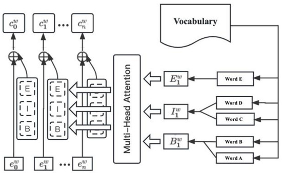 Step 3: Fusion of Word Embeddings for Identified Labels and Word Vector Enhancement. All word embeddings for terms in the B label category are fused using a multi-head attention mechanism. The same applies to the I and E label categories. At this point, the fused word embeddings for the different labels are obtained, denoted as , , . These fused word embeddings are then concatenated with the character embeddings to enhance the word semantics in the final character embeddings, resulting in the enriched character embedding .