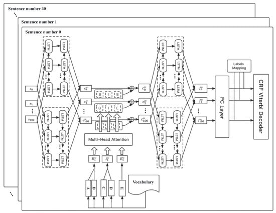 The absence of vocabulary information can lead to the model’s inability to accurately understand the text, resulting in incorrect entity labeling predictions. Therefore, the feature construction method in this section introduces vocabulary information enhancement learning to increase the information content of sentence vectors. Based on Lattice LSTM, this section applies the Multi-Head Attention mechanism [] to fuse the word embedding representations under different labels. After concatenating and stacking the fused word vectors ,, and under different labels, they are added to the character embedding representation to generate a character embedding representation enriched with integrated vocabulary information, thus achieving the goal of vocabulary enhancement. The feature extraction network structure for integrating word vector information is shown in Figure 6.