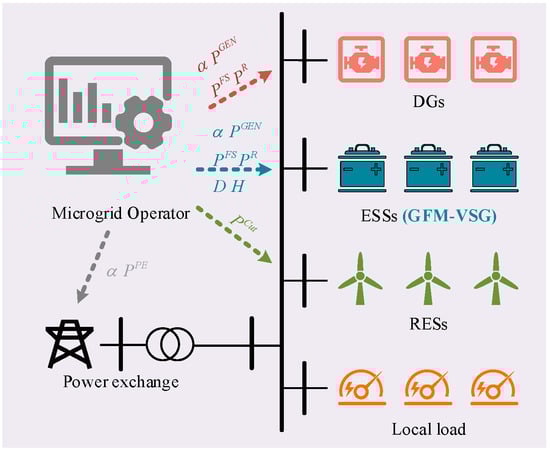 - Power electronic inverters can be categorized into grid-following and grid-forming types. Given that this paper focuses on microgrids, which are typically more fragile, ESSs are considered to be connected to the grid through grid-forming inverters to participate in the construction of frequency [26]. Additionally, the VSG strategy is used to control ESSs, which is considered the most widespread and typical control method [19,27].